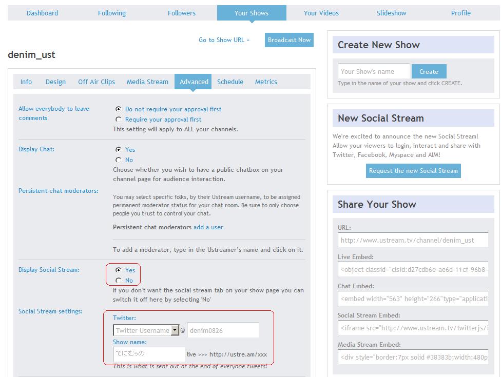 UstreamのYour Showsタブ内のAdvancedタブのSocial Stream関連項目で可能です。