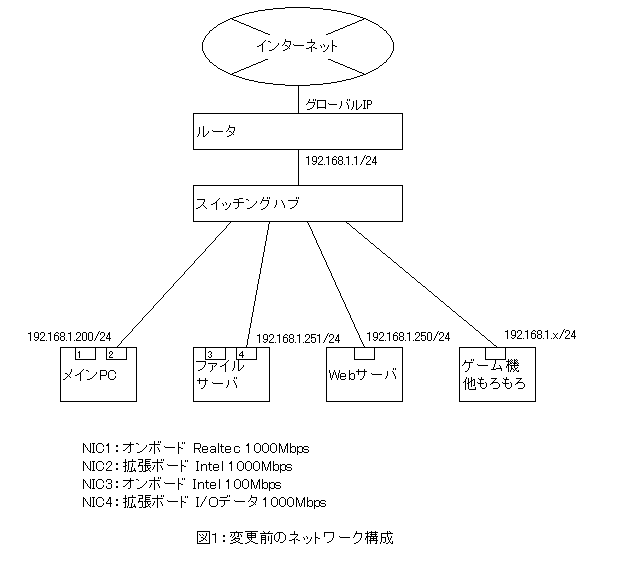 メインPCもファイルサーバも、二つずつNIC(ネットワークインタフェースカード)を持っているので、